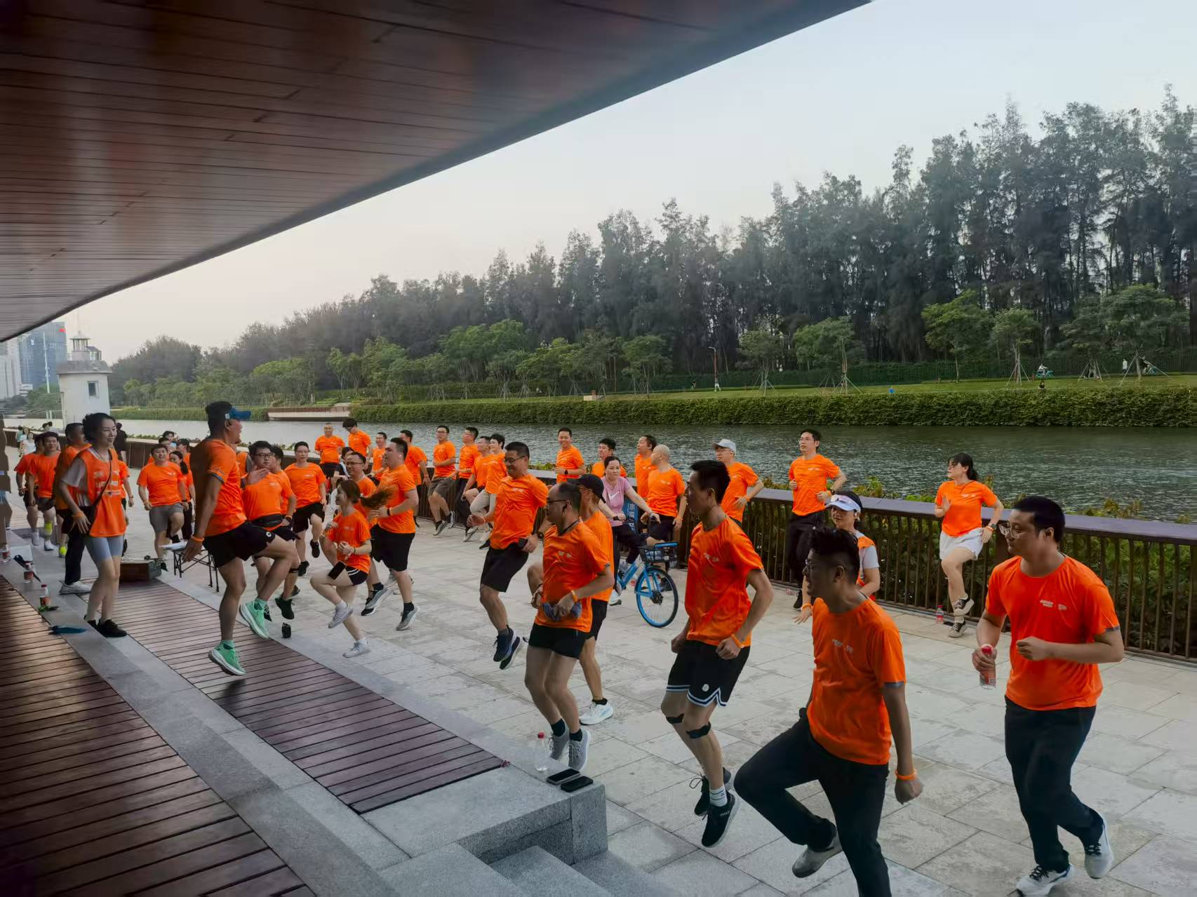 悅跑活動設置了三個組別:“越熱浪”5KM歡樂跑、“三十而勵”8KM活力跑以及“向新而行”12KM競速跑。公司特別定製了30周年紀念版的專屬T恤。大家換上服裝後,跑前拉伸的場景呈現了一片令人矚目的活力橙,盡顯国产蜜桃AV在线免费看人的熱情與活力。