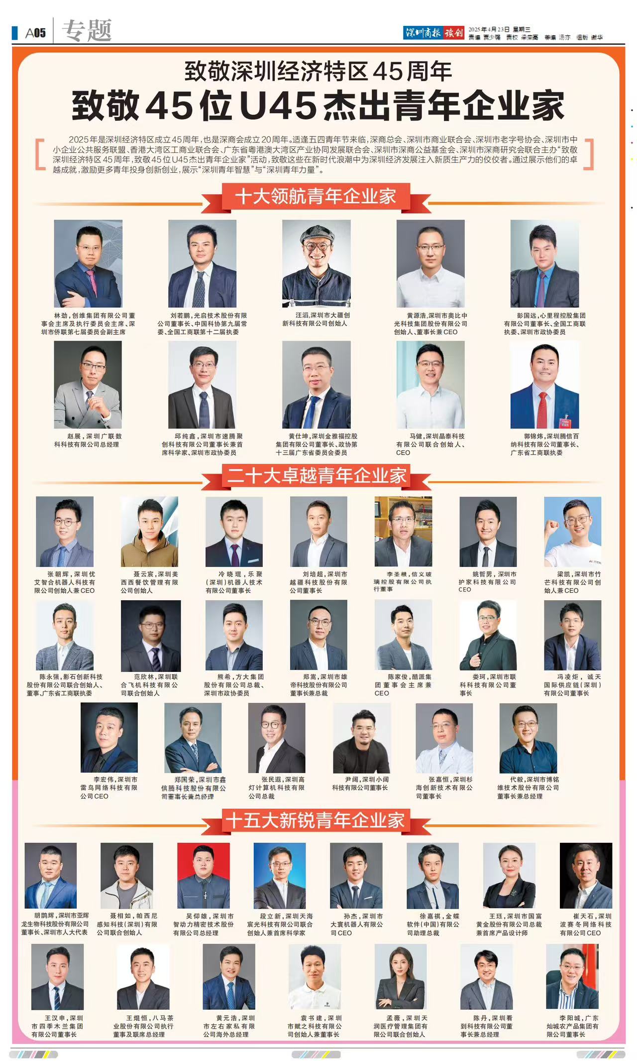 適逢五四青年節,由深商總會、深圳市商業聯合會、深圳市老字號協會、香港大灣區工商業聯合會等多家權威機構聯合主辦的“致敬45位U45傑出青年企業家”活動隆重舉行。該活動旨在表彰在新時代浪潮中為深圳經濟發展注入新質生產力的青年領袖,展示“深圳青年智慧”與“深圳青年力量”。